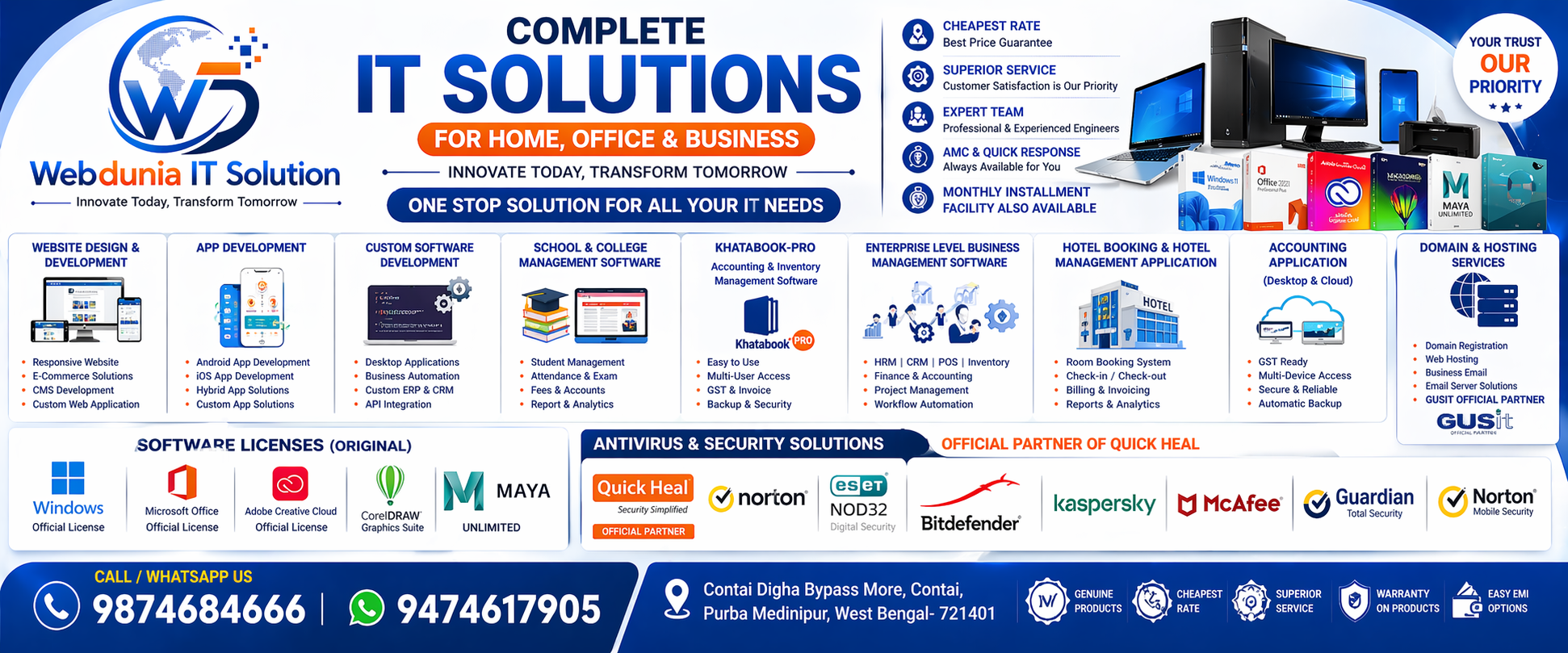 Webdunia IT Solution helps local businesses, schools, offices and home users buy the right IT products, keep systems running, secure premises with CCTV, and launch reliable digital platforms from a locally accessible Contai support point.